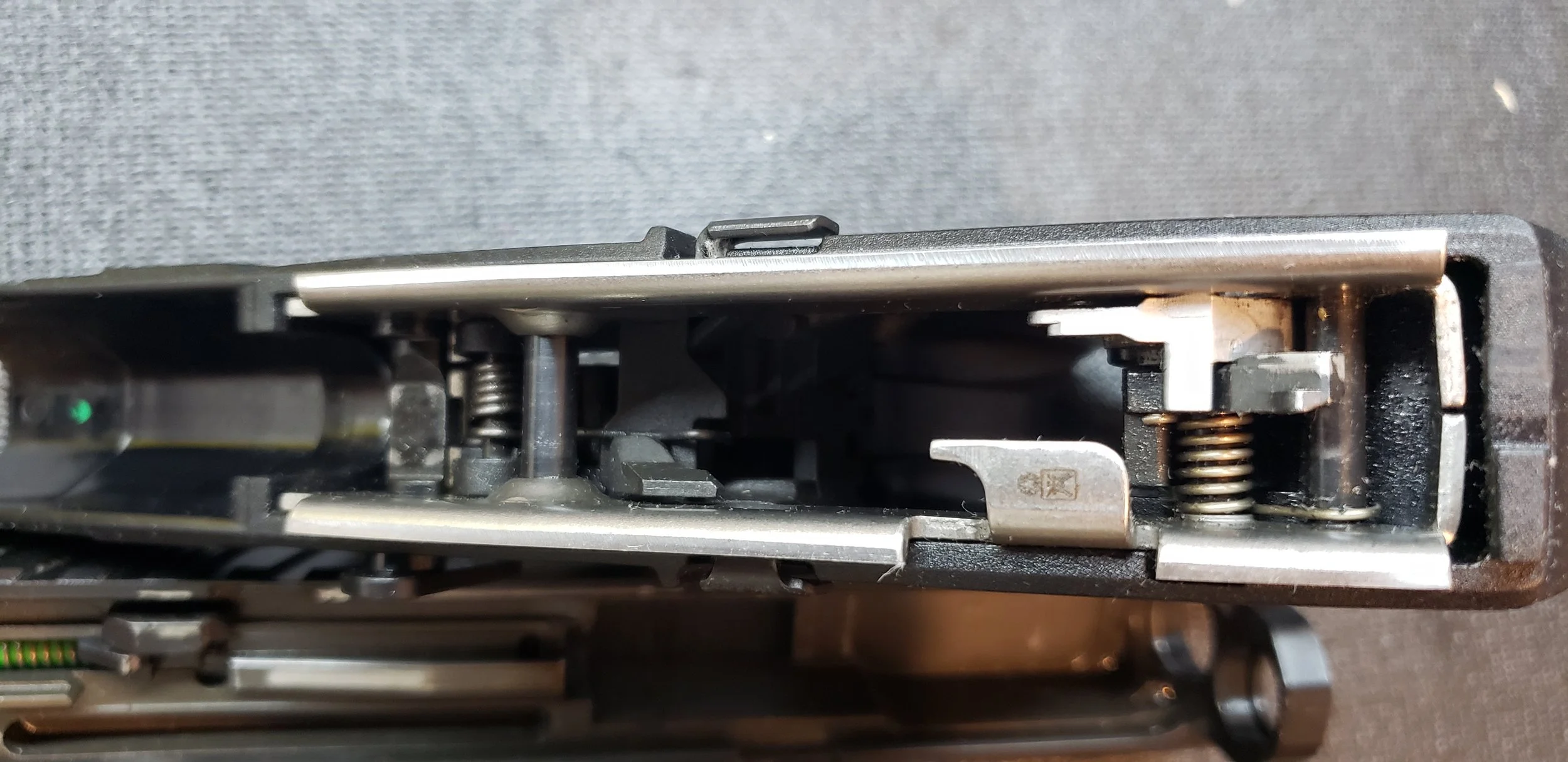 The recoil spring used in the Compact model is similar to the full size model, but it is different at the same time. It is similar because the spring is designed to allow a long service life, but it is different because it is using what looks like 3 different springs in a tiered assembly that is meant to cushion the impact the slide has on the polymer frame and then complete the cycle thousands of times without fail.