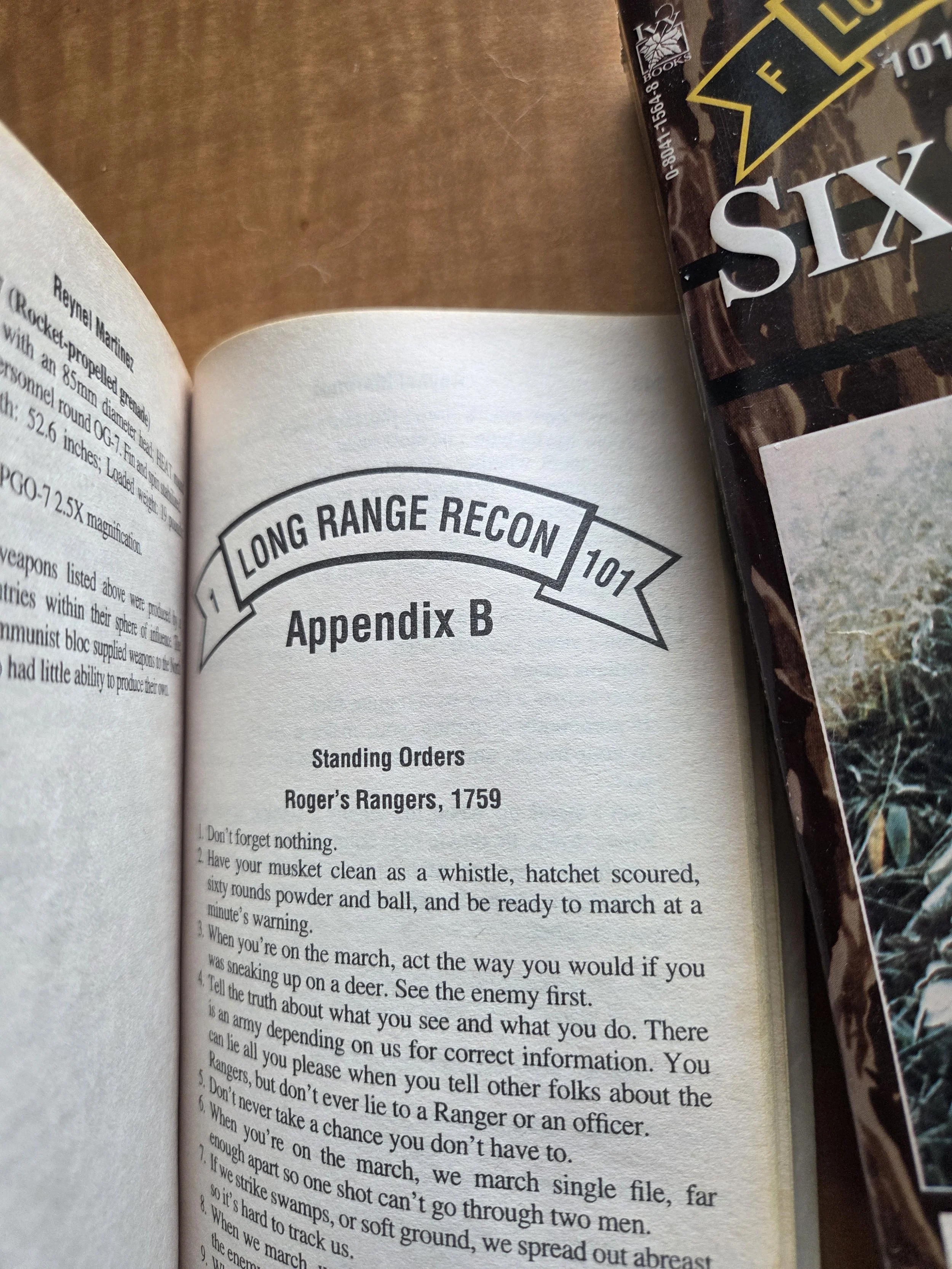 I absolutely love the end of the first book and how he goes into the details of the gear used by LRRPs. He explains the burdens of the weight carried on operations throughout the book, but you get to see each weapon articulated and explained as to what it is for and its origin or how it is carried. You also get an Appendix section detailing the rules of Rogers Rangers, which are still relevant and form the basis for operations performed by light infantry today.